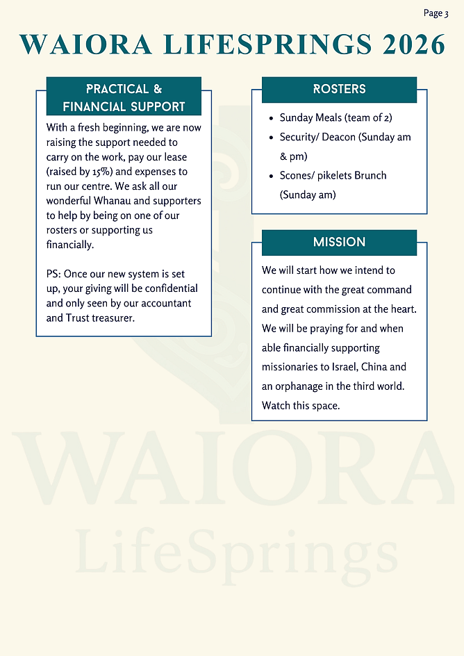 Finances and assets, as well as our special character, will be the responsibility of our Waiora Trust Board and Advisors, and we intend to be transparent and accountable. We will also be connecting with and networking among local pastors and congregations.